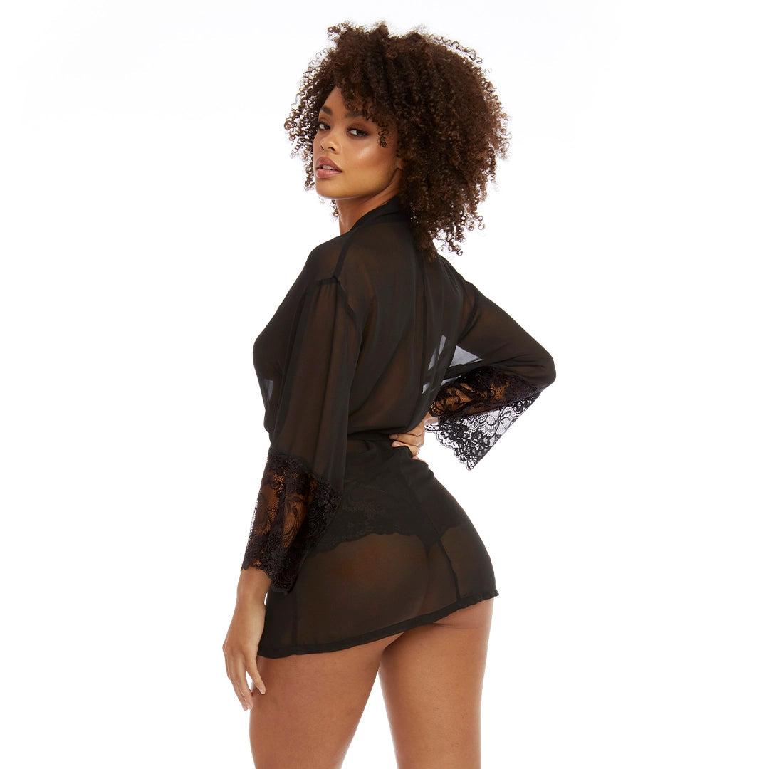 This sheer Mesh robe is the perfect length for flirting and boasts gorgeous lace ttrim on the kimono sleeves. Comes with Mattching lace boyshorts that are soft and somfy so you look and feel your best!